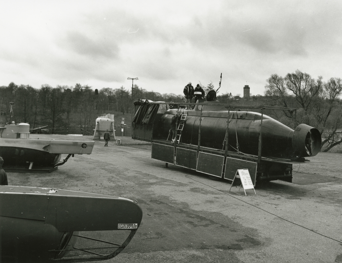 Aktivitet utanför Sjöhistoriska museet i samband med utställningen "Ubåtar, finns dom". Några ubåtar visas.