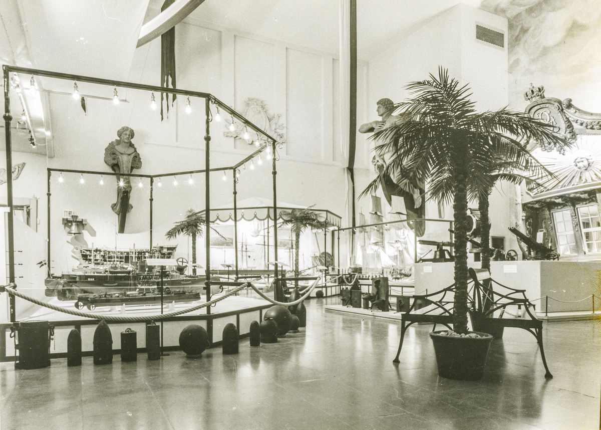 Utställningen "Flottans paviljong". Överblicksbild av utställningen i minneshallen.