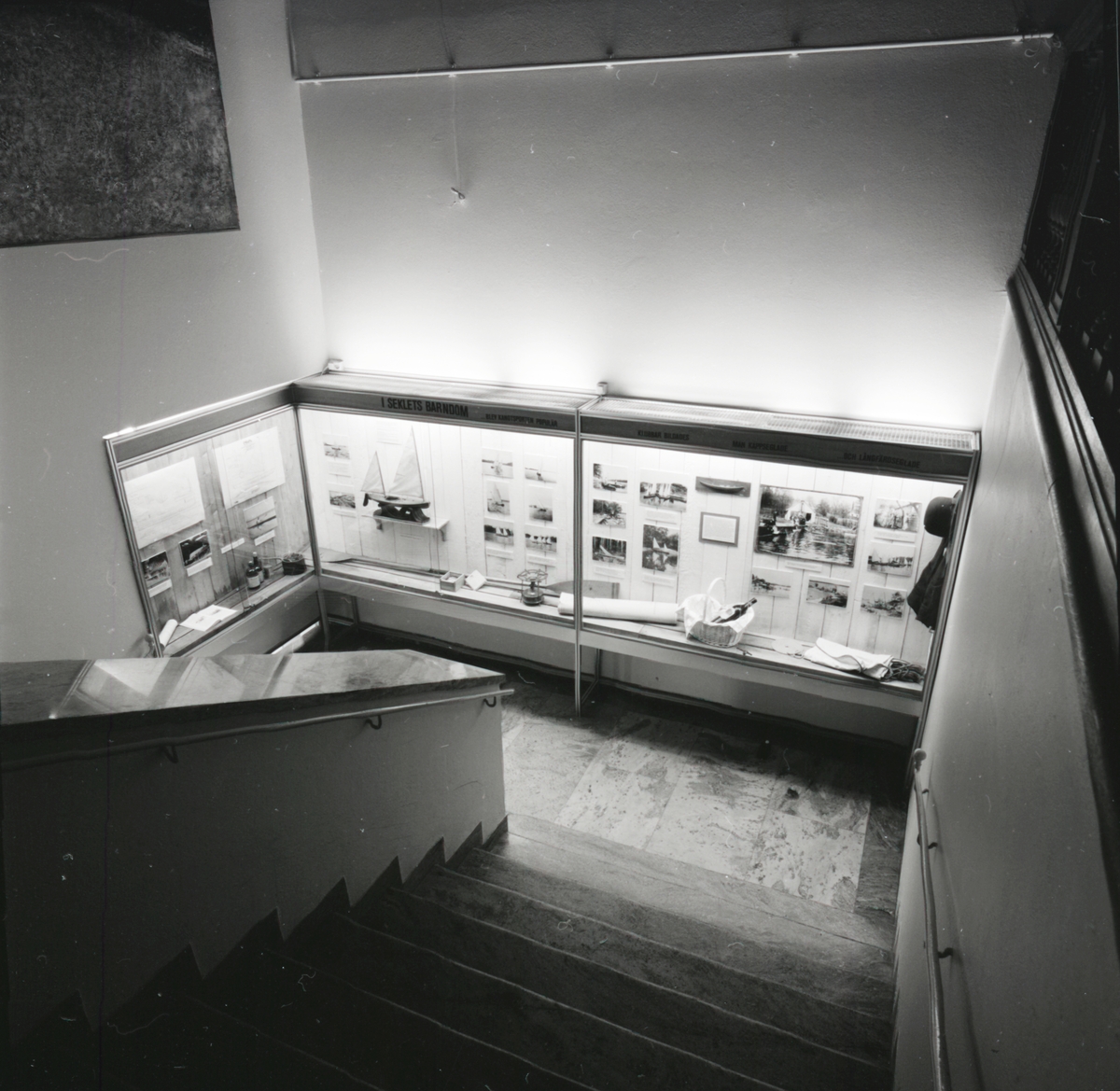 Utställningen "Segelkanoter" i trappmonter. Överblicksbild.