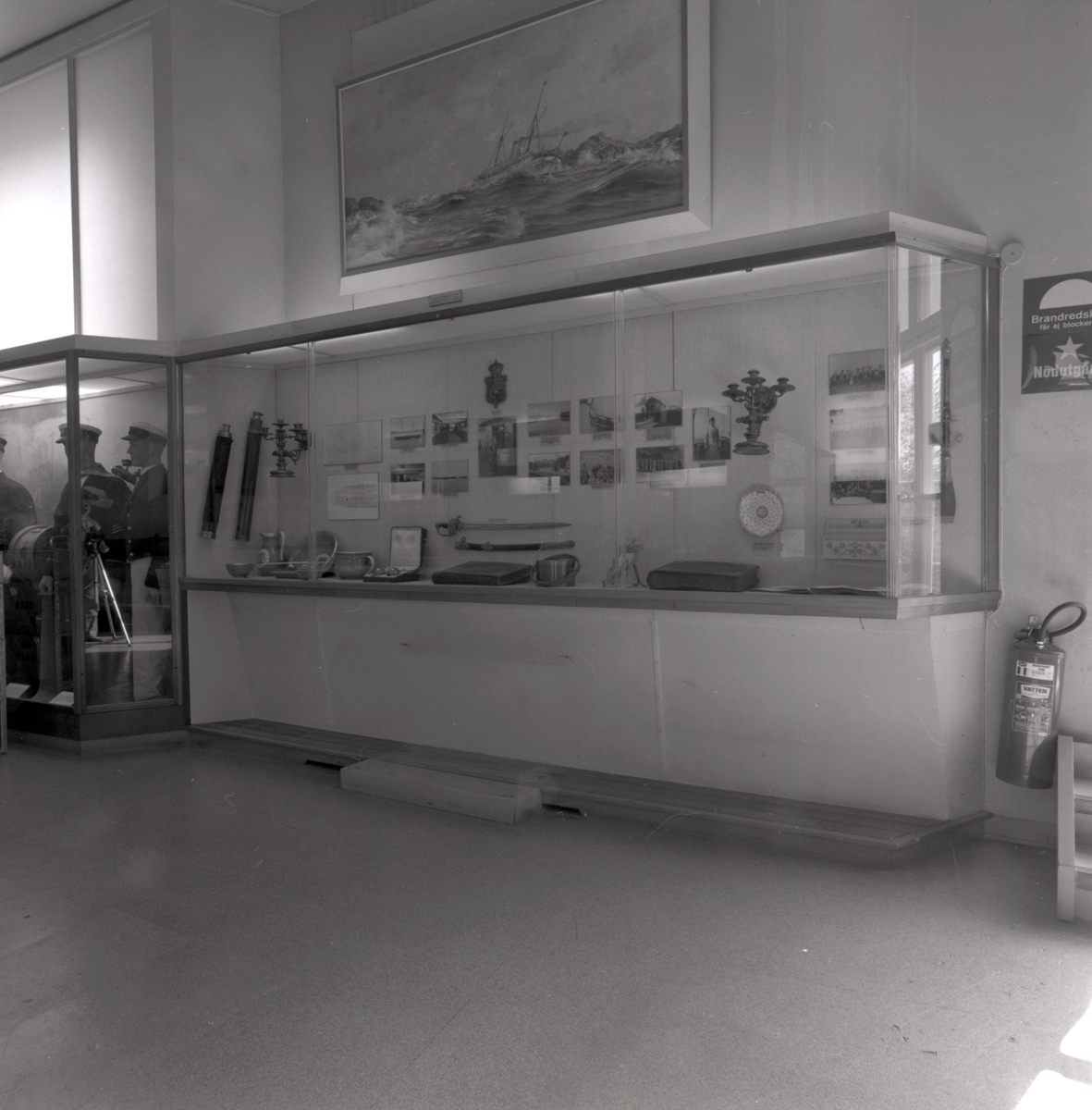 Marina utställningen innan ombyggnad till café. Del av utställningen med montrar längs väggen.