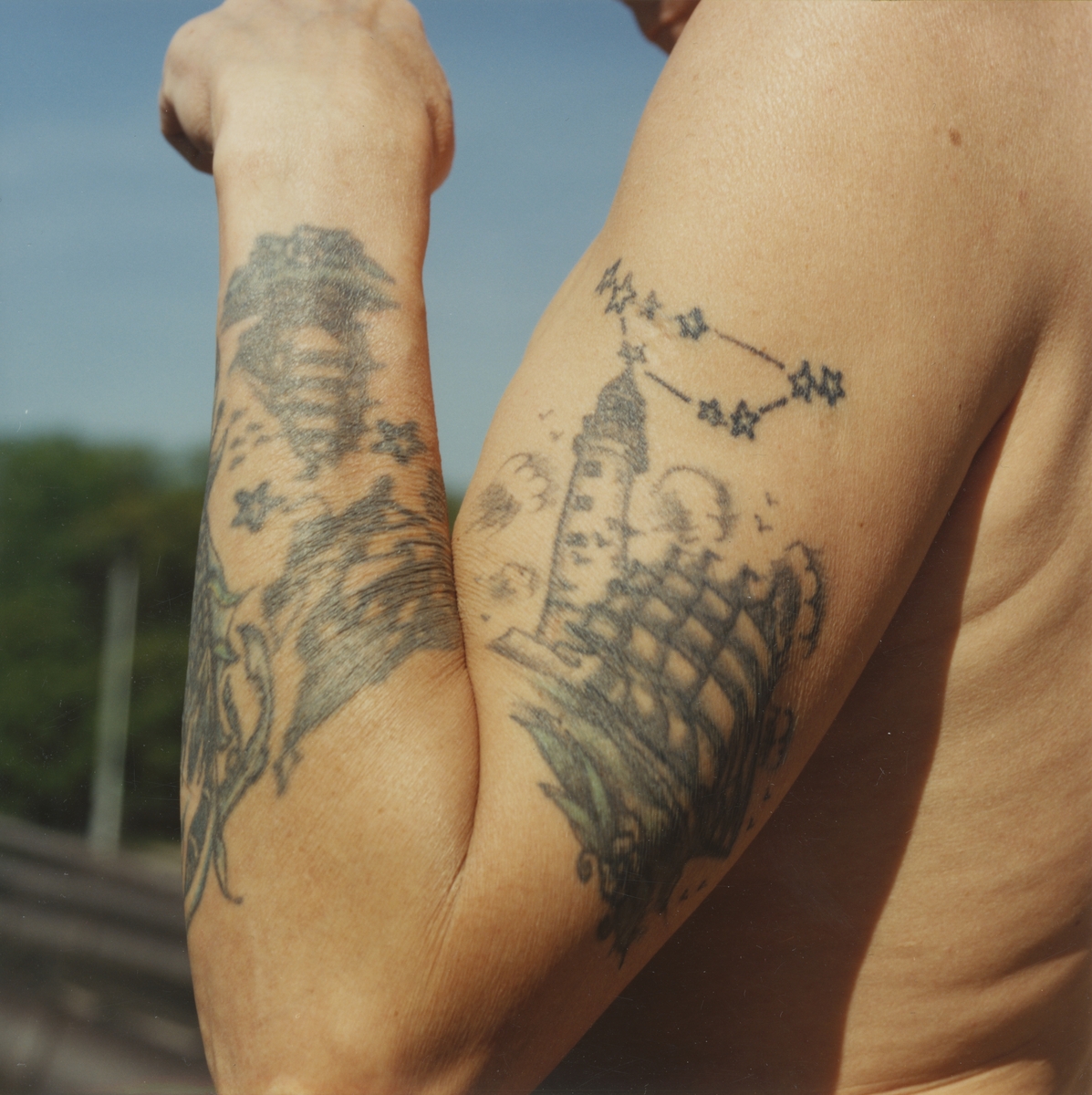 Utställningen "Tatuering". Förstudie till utställningen. En mans tatuering med sjöfartstema på hans vänstra arm.