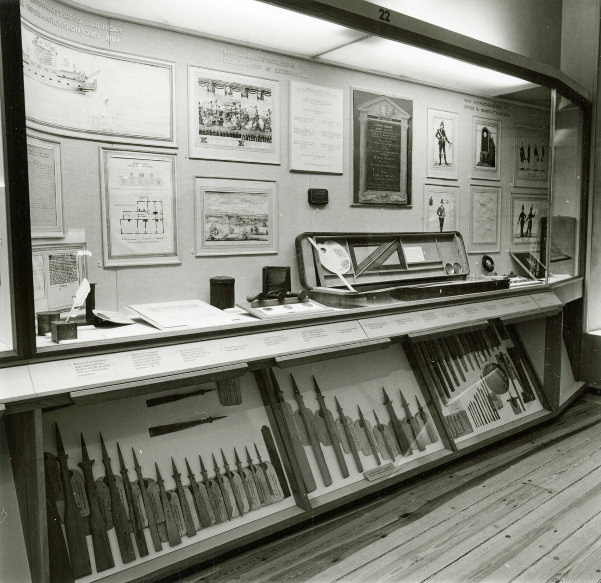 Sjöhistoriska museets permanenta utställning fotograferad 1987. Monter som visar Från skeppsbyggmästarens lärlingar 1716 till informationskontoret 1804 och Från amiralitetskollegium till förvaltningen av sjöärenden.