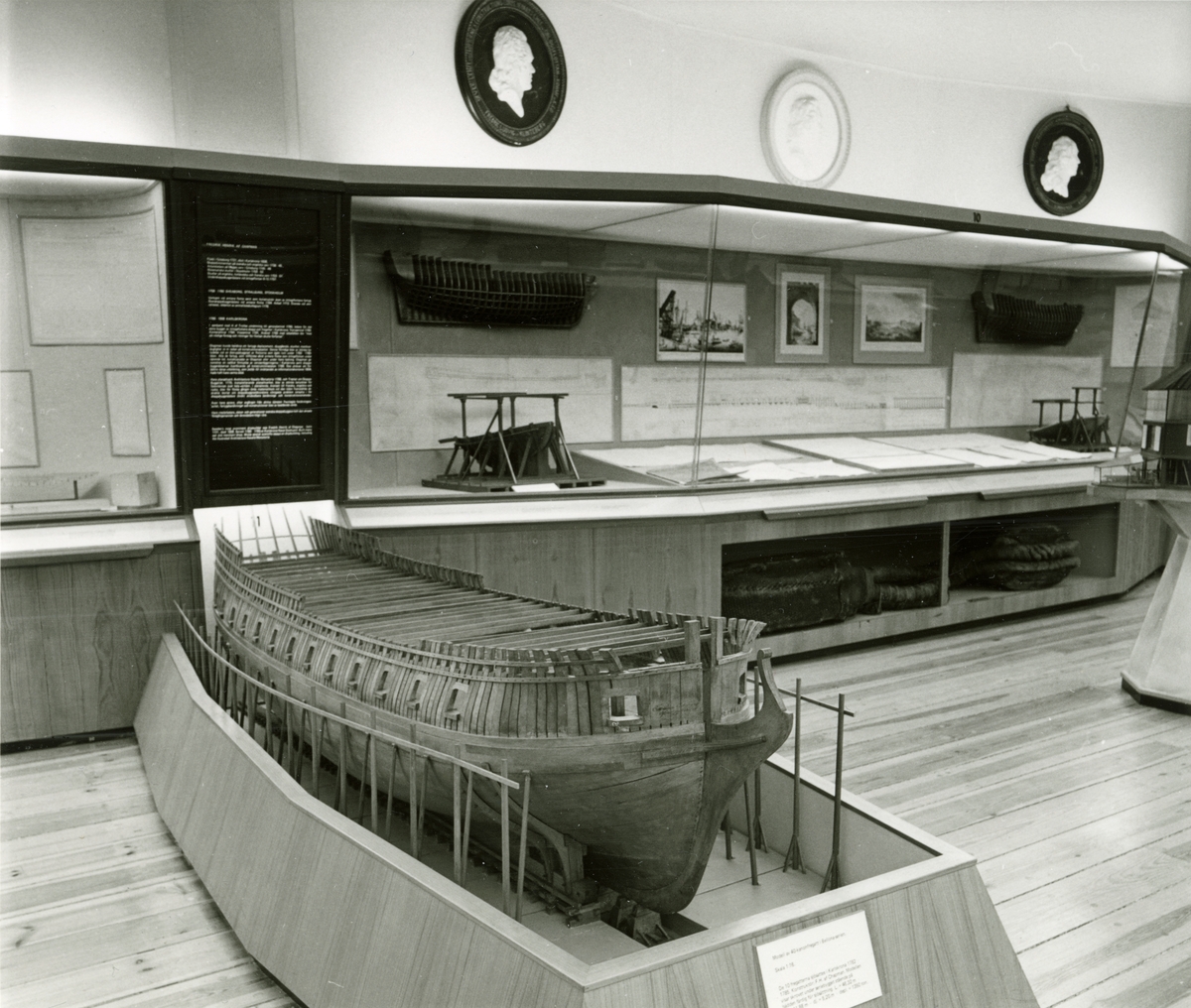Sjöhistoriska museets permanenta utställning fotograferad 1987. Sal 3. Monter om F H af Chapmans skeppsbyggeri. Ritningar, fartygsmodell, halvmodell och dokument.