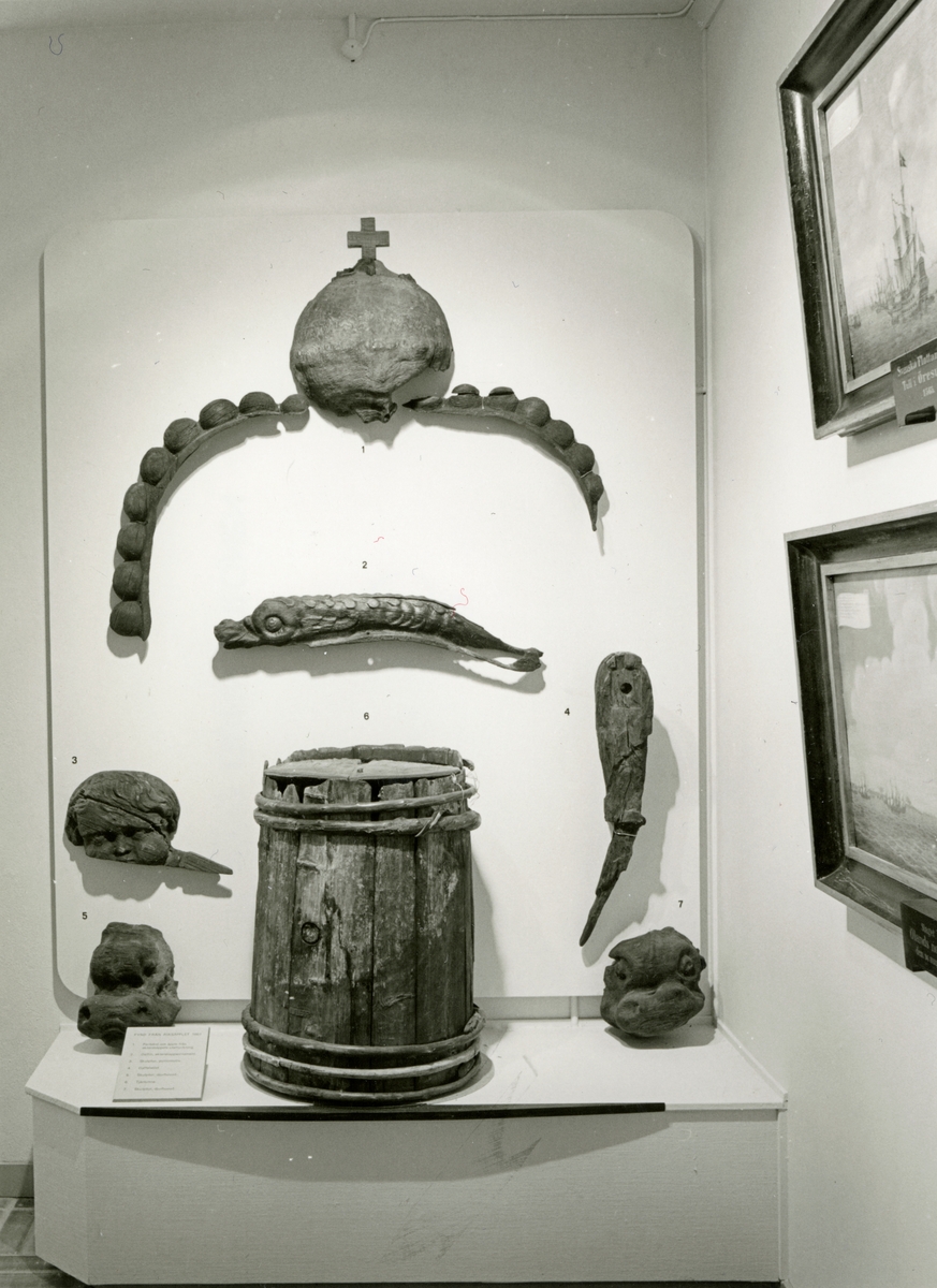Sjöhistoriska museets permanenta utställning fotograferad 1987. Fartygsornament.