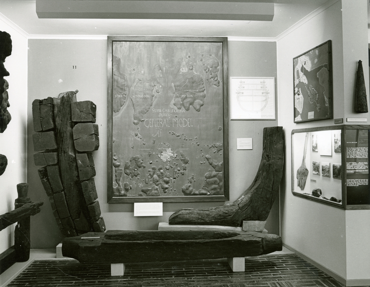 Sjöhistoriska museets permanenta utställning fotograferad 1987. Vrakdelar från äldre fartyg samt väggmodell av Karlskrona.
