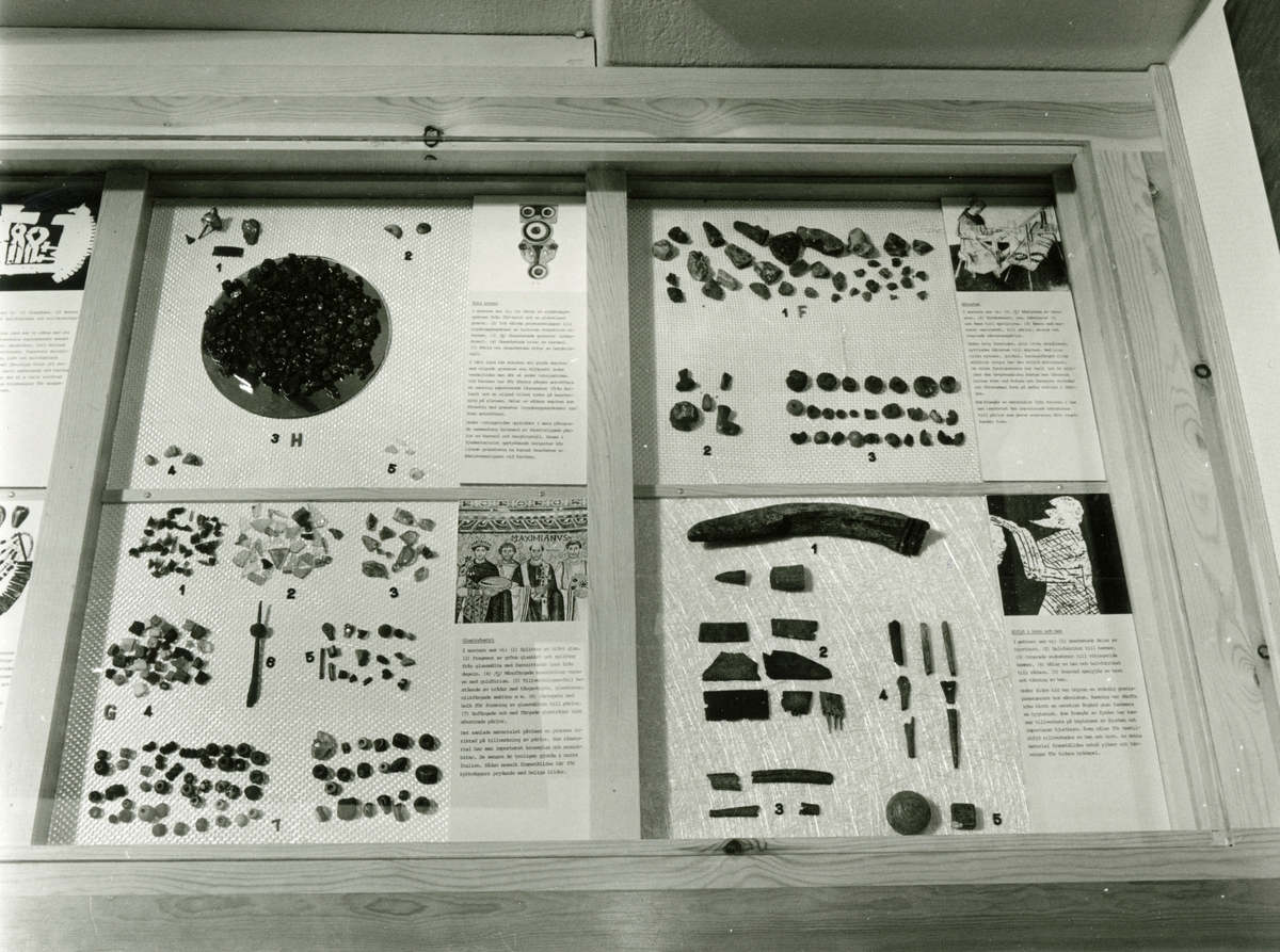 Sjöhistoriska museets permanenta utställning fotograferad 1987. Monter som visar äldre sjöfynd i form av fragment av ädelsten, glas, bärnsten, horn och ben.