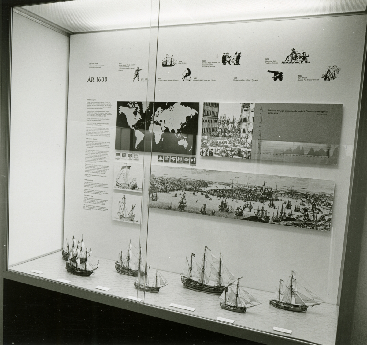 Sjöhistoriska museets permanenta utställning fotograferad 1987. Monter visande 1600-talets sjöfart. Text och fartygsmodeller.
