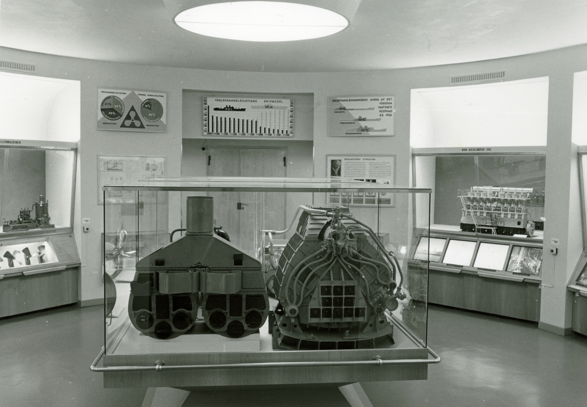 Sjöhistoriska museets permanenta utställning fotograferad 1987. Modeller av fartygsmotorer. Utvecklingen från kol till olja som drivmedel.