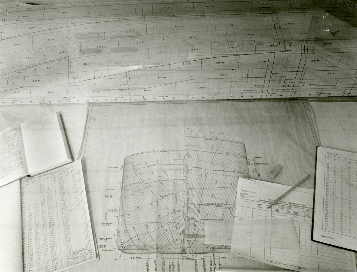 Sjöhistoriska museets permanenta utställning fotograferad 1987. Fartygsritning.