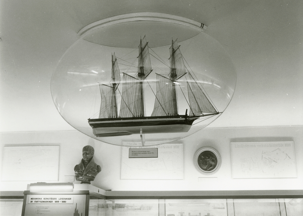 Sjöhistoriska museets permanenta utställning fotograferad 1987. Sal 4 Från segel till ånga, från trä till järn. Sfärisk monter visande fartygsmodell av skonertskepp med i fartygsbotten upptagna rännor för skovelhjul.