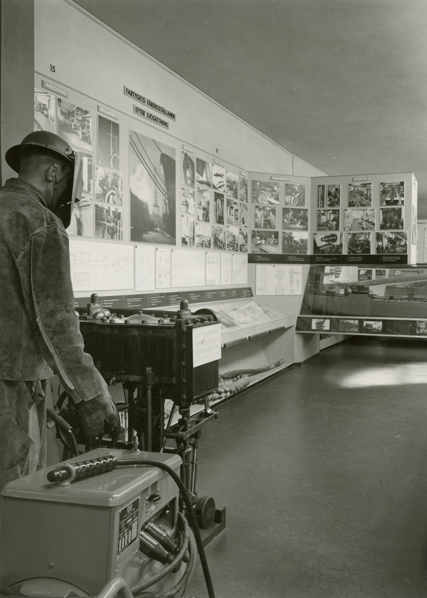 Sjöhistoriska museets permanenta utställning fotograferad 1987. Del av utställningen som visar färdigställande av ett fartyg efter sjösättning.