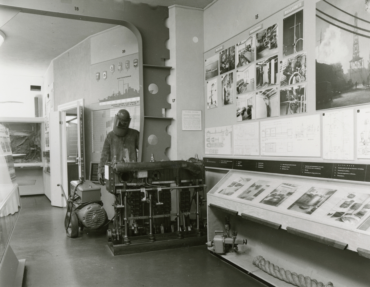 Titel: Sjöhistoriska museets permanenta utställning fotograferad 1987. Del av utställningen som visar ett fartygs färdigställande efter sjösättning.