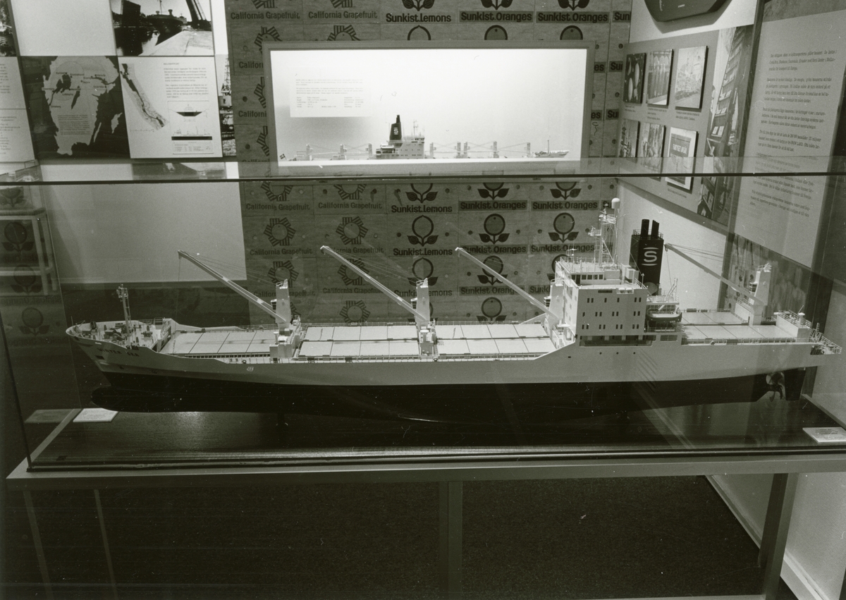 Sjöhistoriska museets permanenta utställning fotograferad 1987. Fartygsmodell av lastfartyget WINTER SEA. Del av utställningen som visar lastning och frakt av frukt.