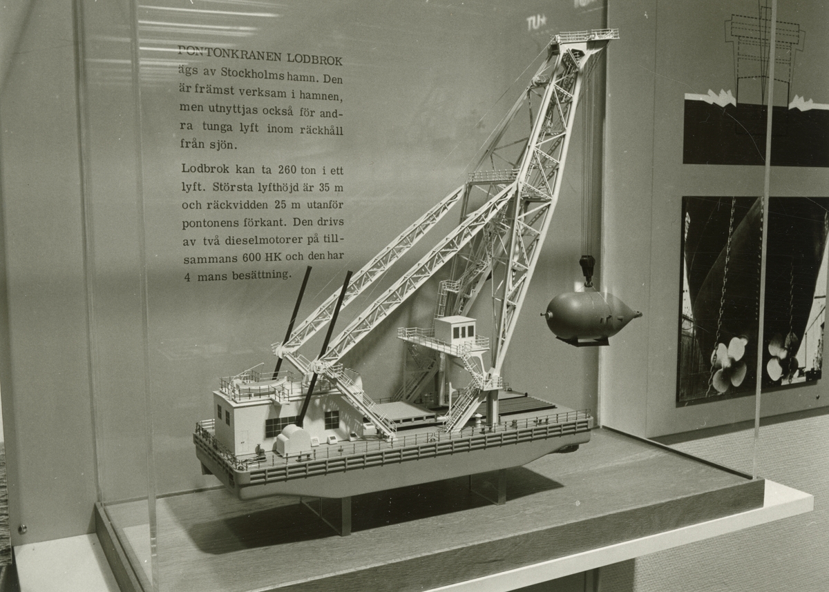 Sjöhistoriska museets permanenta utställning fotograferad 1987. Modell av pontonkranen Lodbrok.