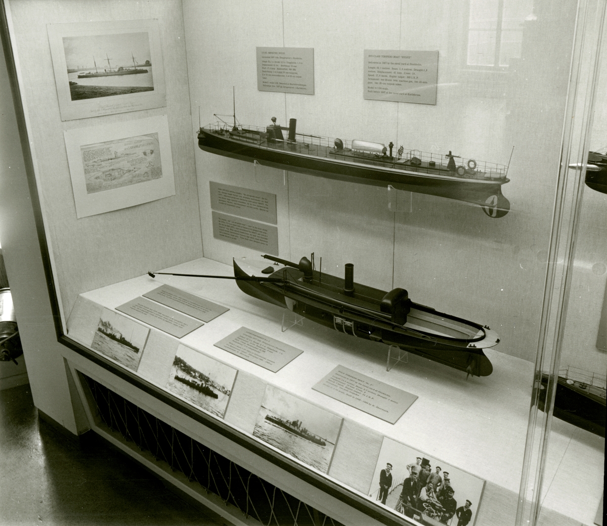 Den permanenta utställningen fotograferad 1987. Modeller av torpedbåtar från sent 1800-tal i monter.