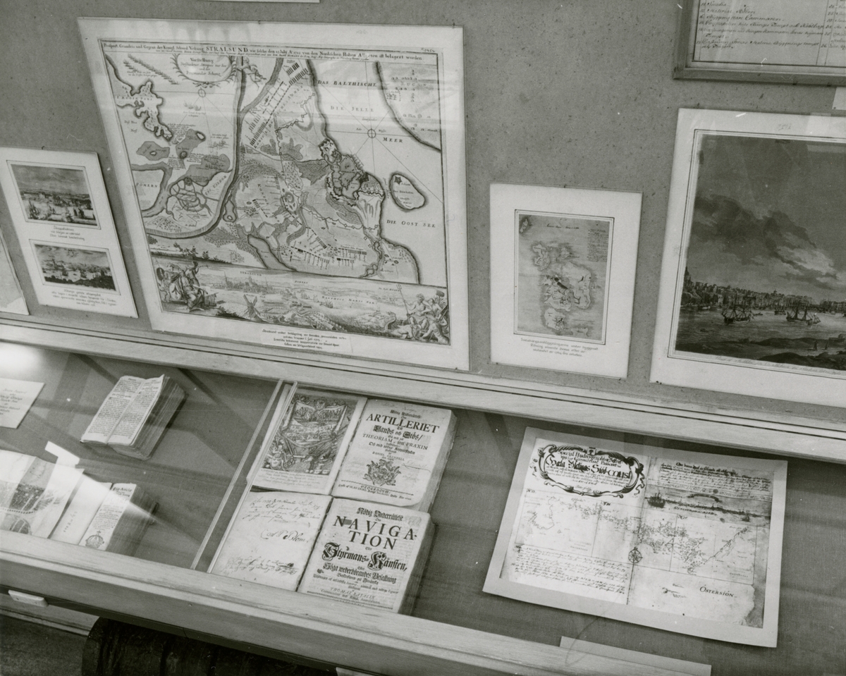 Den permanenta utställningen fotograferad 1987. Äldre kartor och böcker om navigering m.m.