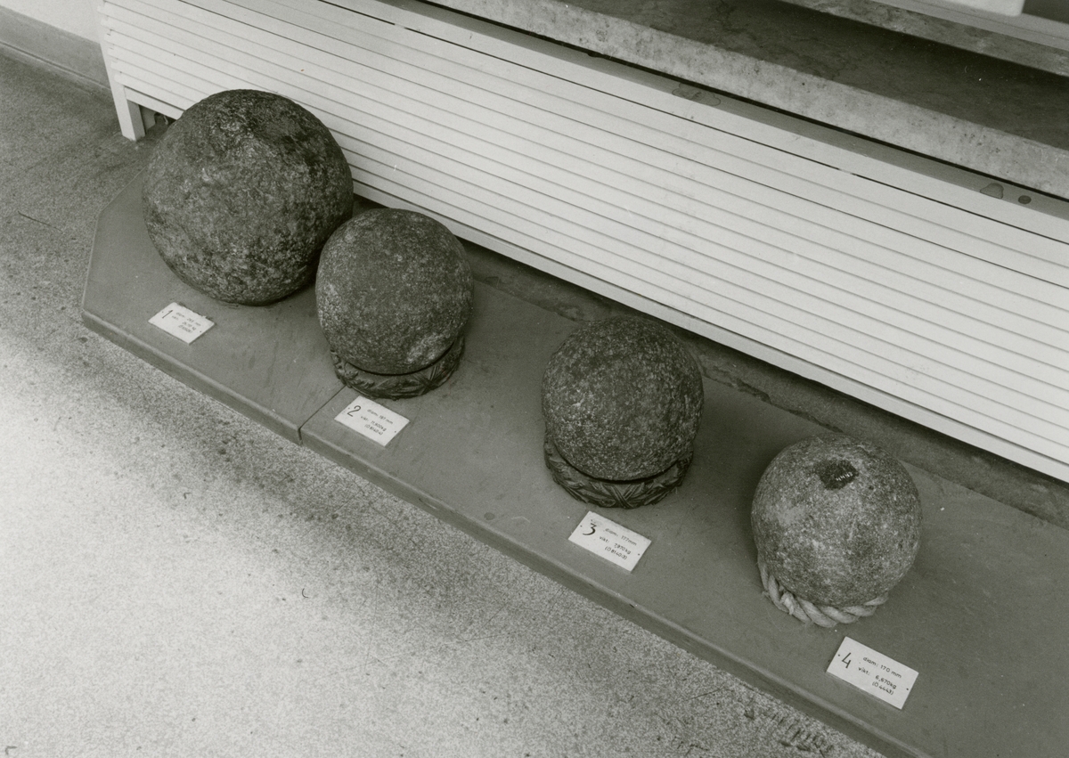Den permanenta utställningen fotograferad 1987. Fyra stycken kanonkulor av äldre typ.