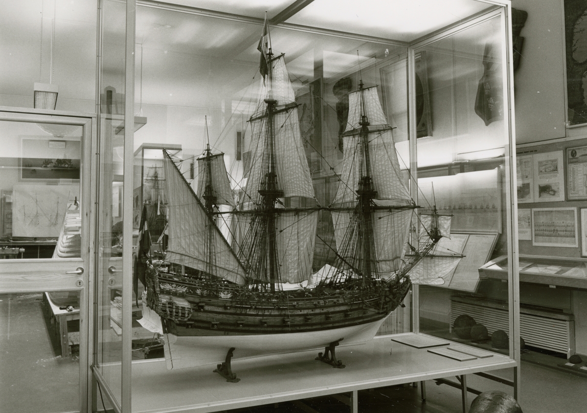 Den permanenta utställningen fotograferad 1987. Fartygsmodell av AMARANT och en skymt av Brännaren i dåvarande Stormaktsrummet. I bakgrunden pågår byggandet av en fartygsmodell av VASA i skala 1:10.