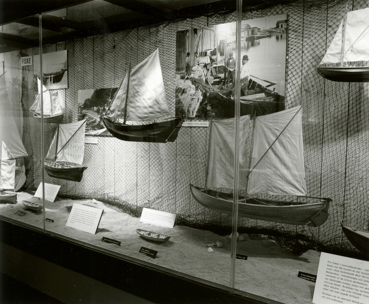 Den permanenta utställningen fotograferad 1987. Monter om fiske innehållande fartygsmodeller av allmogebåtar.
