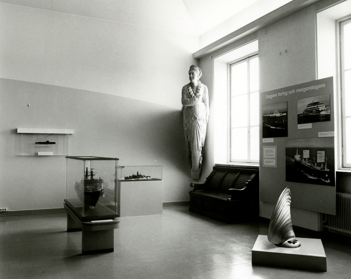 Varvsutställningen. Del av utställningen som illusterar "Dagens fartyg och morgondagens" med galjonsfigur, fartygsmodeller m.m.