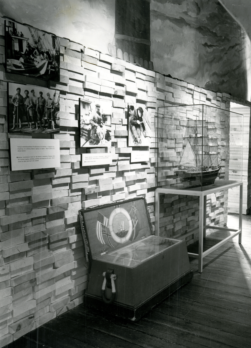 Varvsutställningen. Del av utställningen med en sjömanskista och en fartygsmodell.