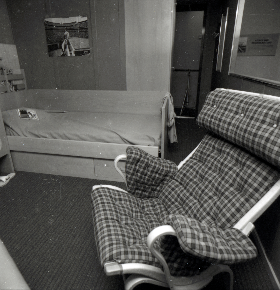 Utställning med Jungman Janssons hytt i utställningen Moderna sjöfarten. Sängen och fåtöjen i hytten.