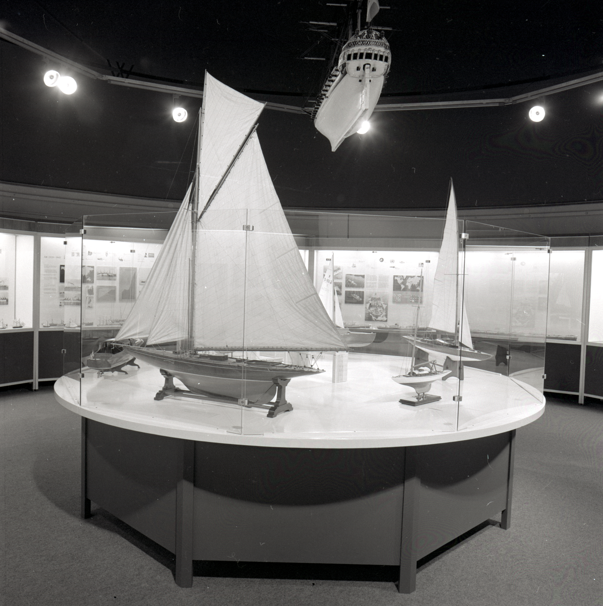 Titel: Utställning i runda rummet. Fartygsmodeller av fritidsbåtar i en monter mitt i rummet.