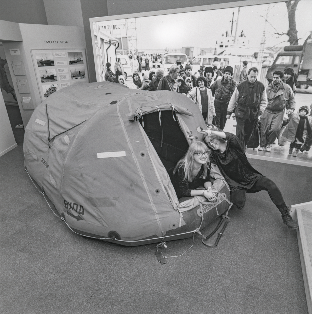 Två museipedagoger visar en räddningsflotte i utställningen Smuggling på Sjöhistoriska museet.