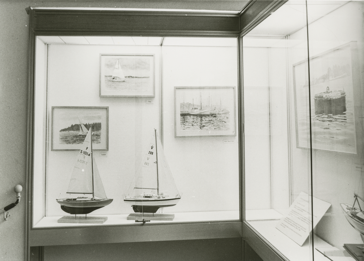 Utställning med konstnären Tore Palms alster i trappmonter på Sjöhistoriska museet samt fartygsmodeller av Folkbåt F S1054 och Vega V288.
