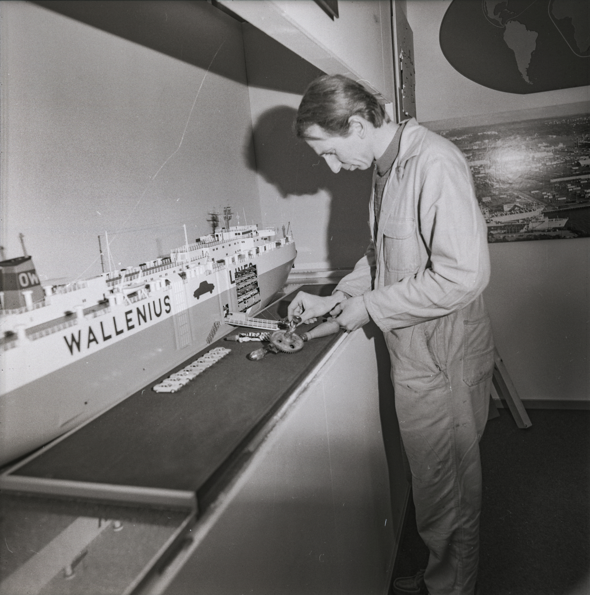 Utställningsarbetet med nya handelssjöfartsutställningen. Göran Forss monterar vid en fartygsmodell av ett Wallenius-biltransportfartyg.