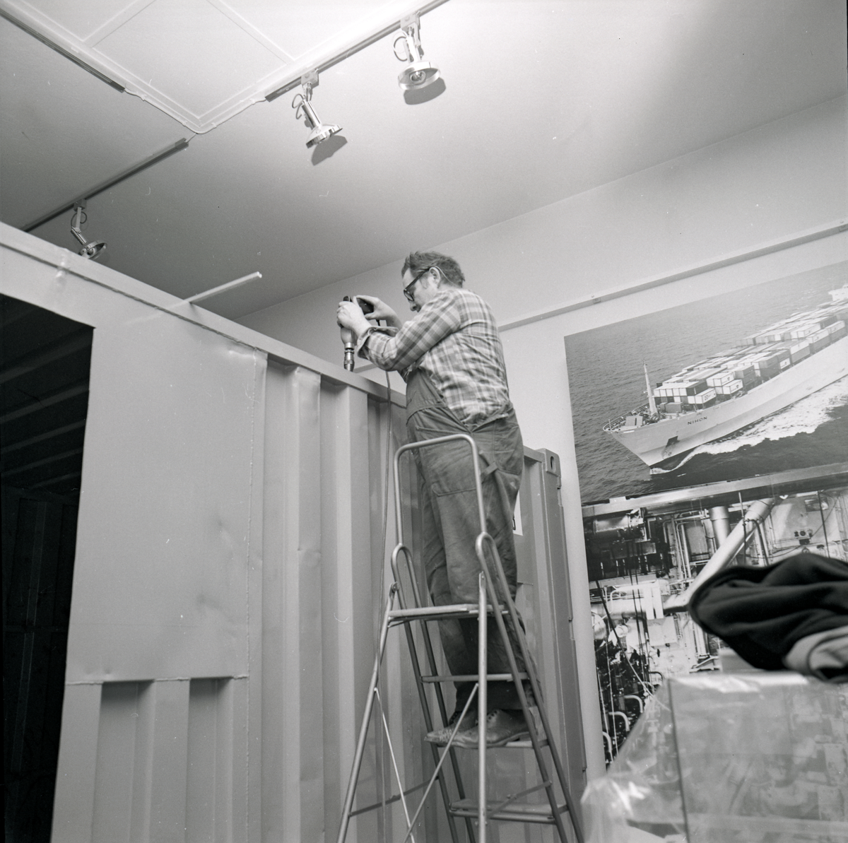 Utställningsarbetet med nya handelssjöfartsutställningen. Arbete med containern i utställningen.
