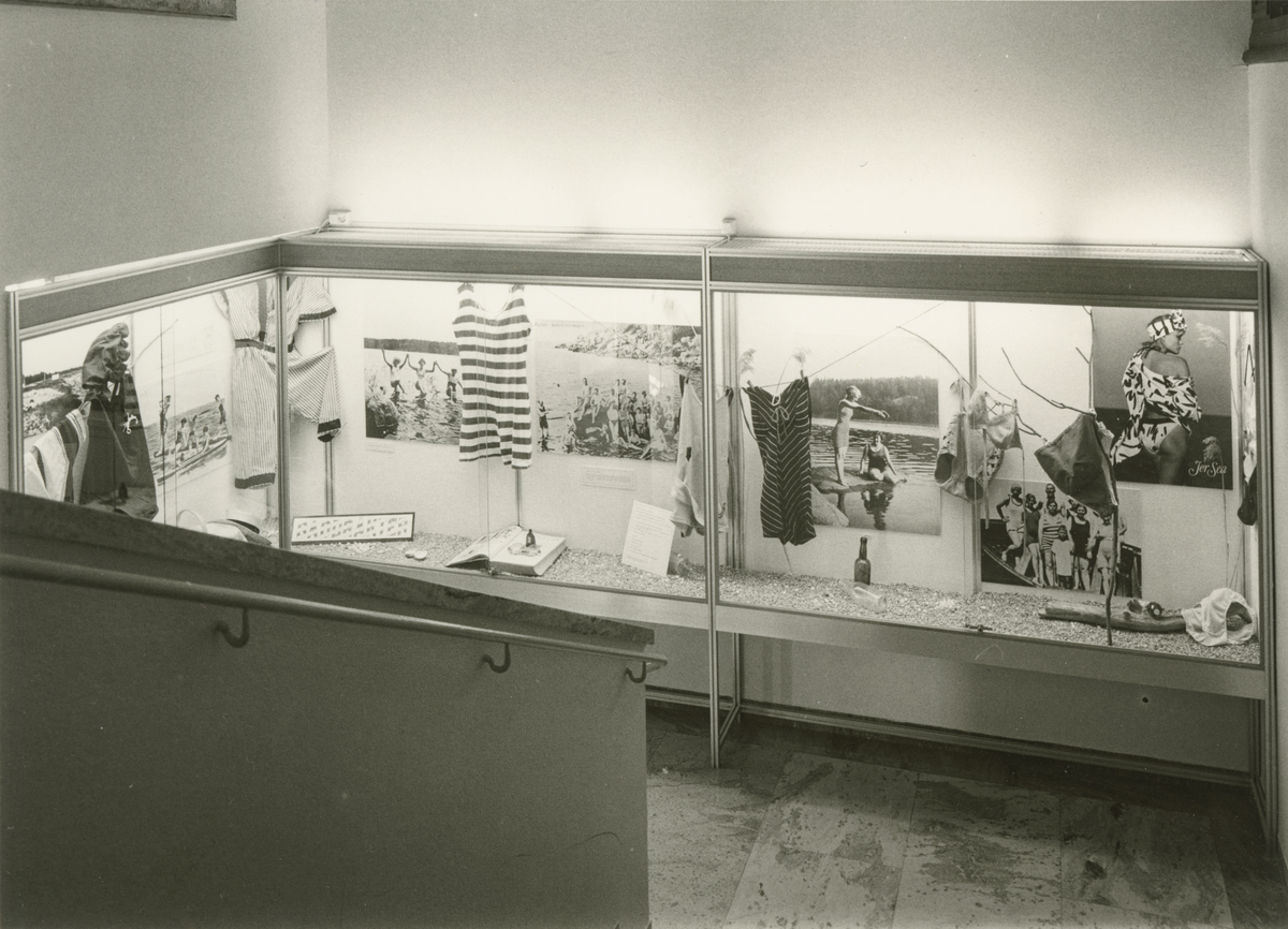 Utställningen Baddräkter i trappmonter. Överblicksbild.