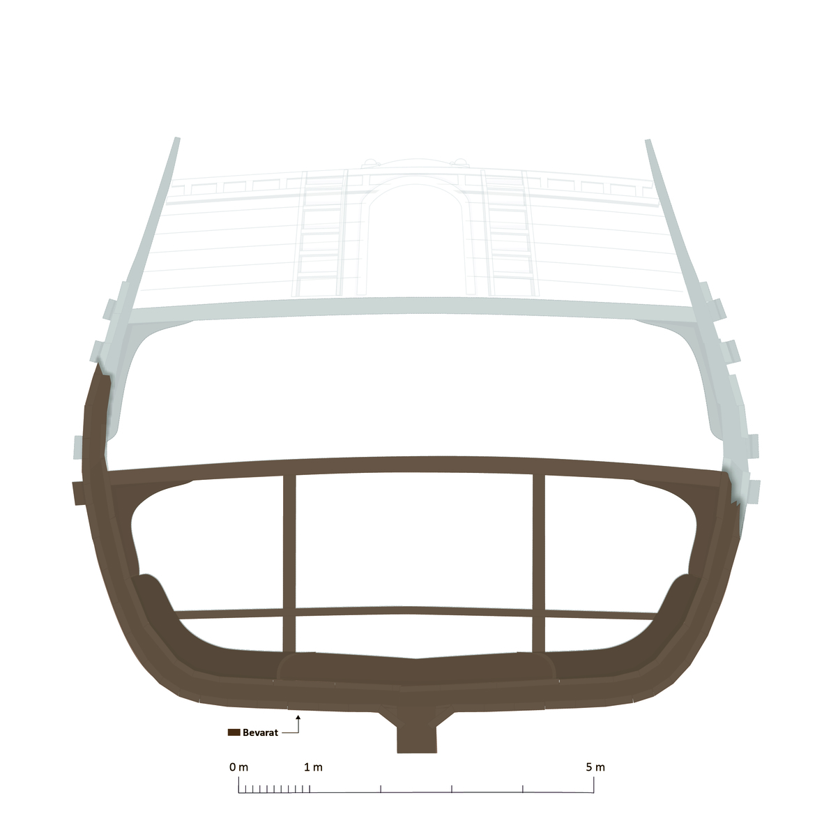 Profilen på Apollo bygger på de arkeologiska måtten på balkarna, spanten, bordläggningen och innergarneringen. Det bruna partiet är en uppskattning av vrakets bevarade delar baserat på dokumentationen. Layout: Alexander Rauscher.