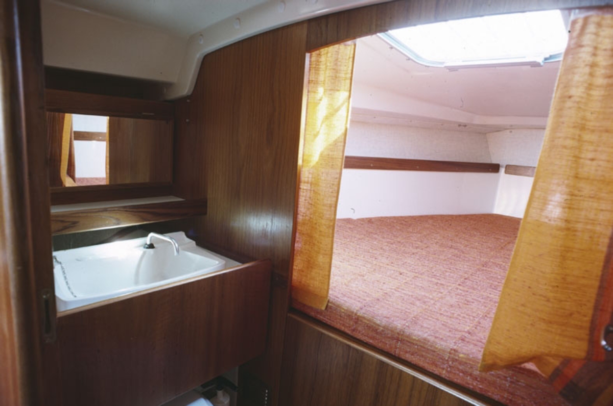 Interiör, tvättställ och dubbelkoj i Scampi 30.