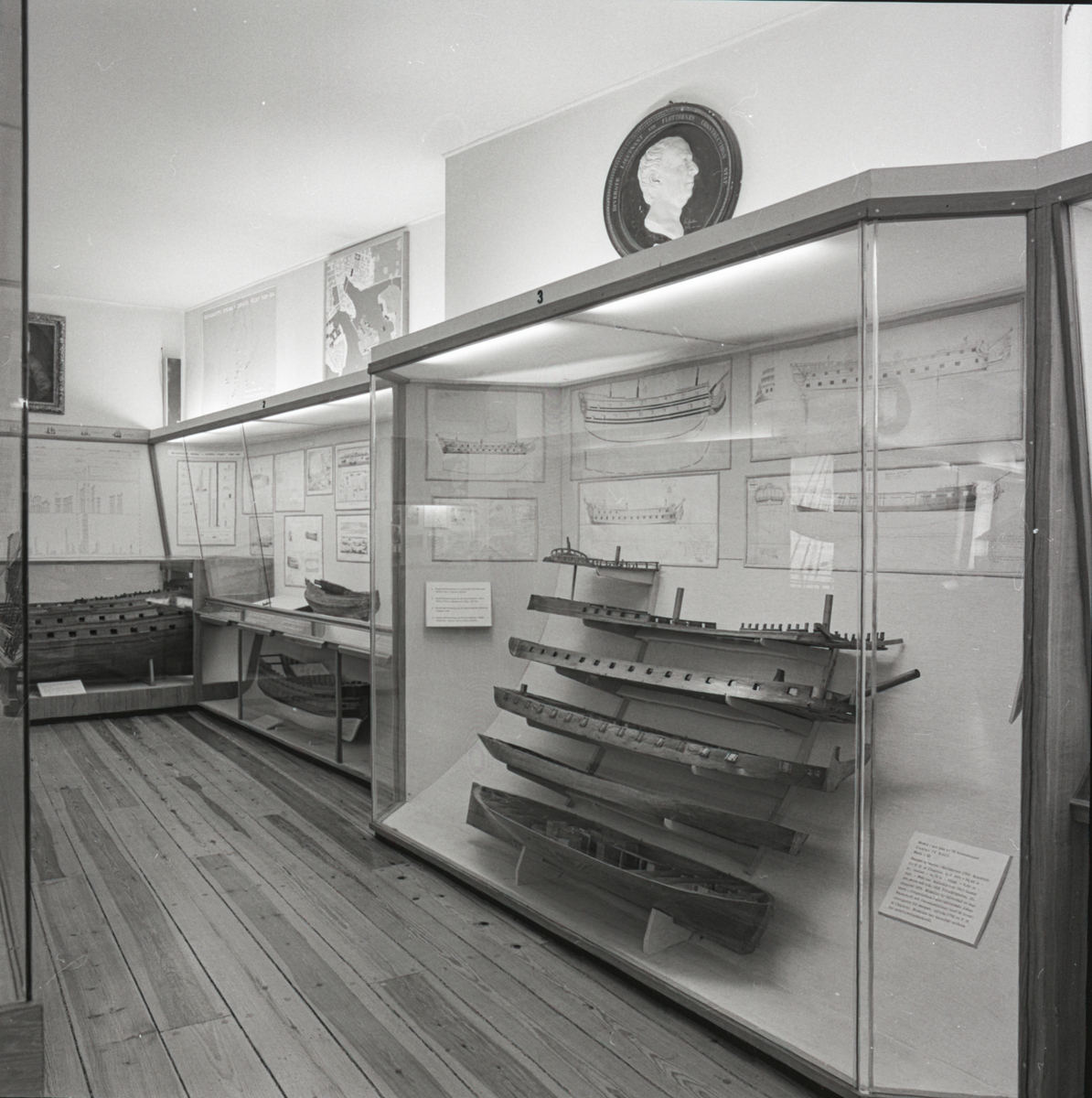 Skeppsbyggeriutställningen i samband med renoveringen 1985. Överblick av utställningen med fartygsmodeller i montrar. Bl.a. fartygsmodell i sex plan av 74-kanonskeppet GUSTAV IV ADOLF.
