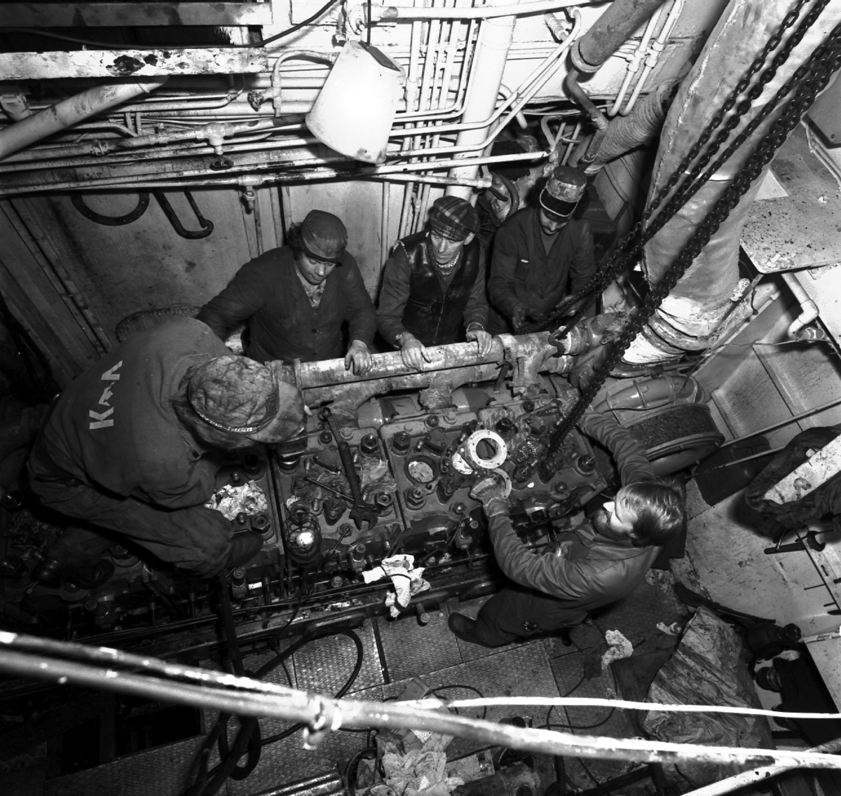 Interiiör av maskinrum i fiskebåten Hasslö