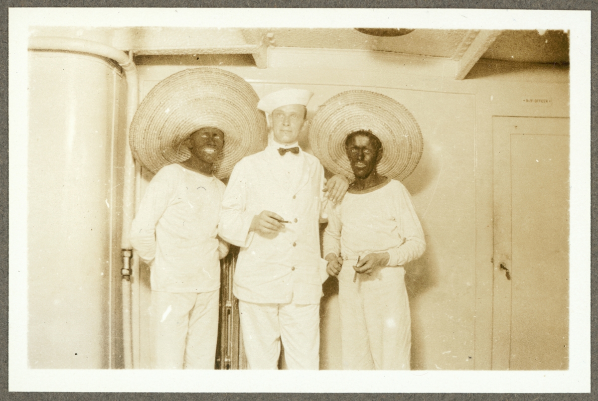Bilden föreställer sjömannen Holmberg flankerad av två kamrater som har klädd ut sig som svartfärgade människor som kallas för "Jim", förmodligen som del av den humoristisk förställning ombord. Denna företeelse kallas idag för "blackfacing" och är uttryck för oacceptabla rasfördomar.