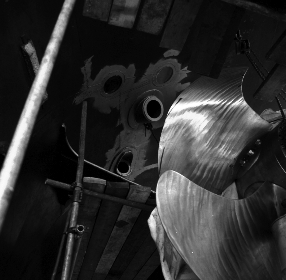 Luckor i bottnen vid propellrarna på minfartyget Carlskrona