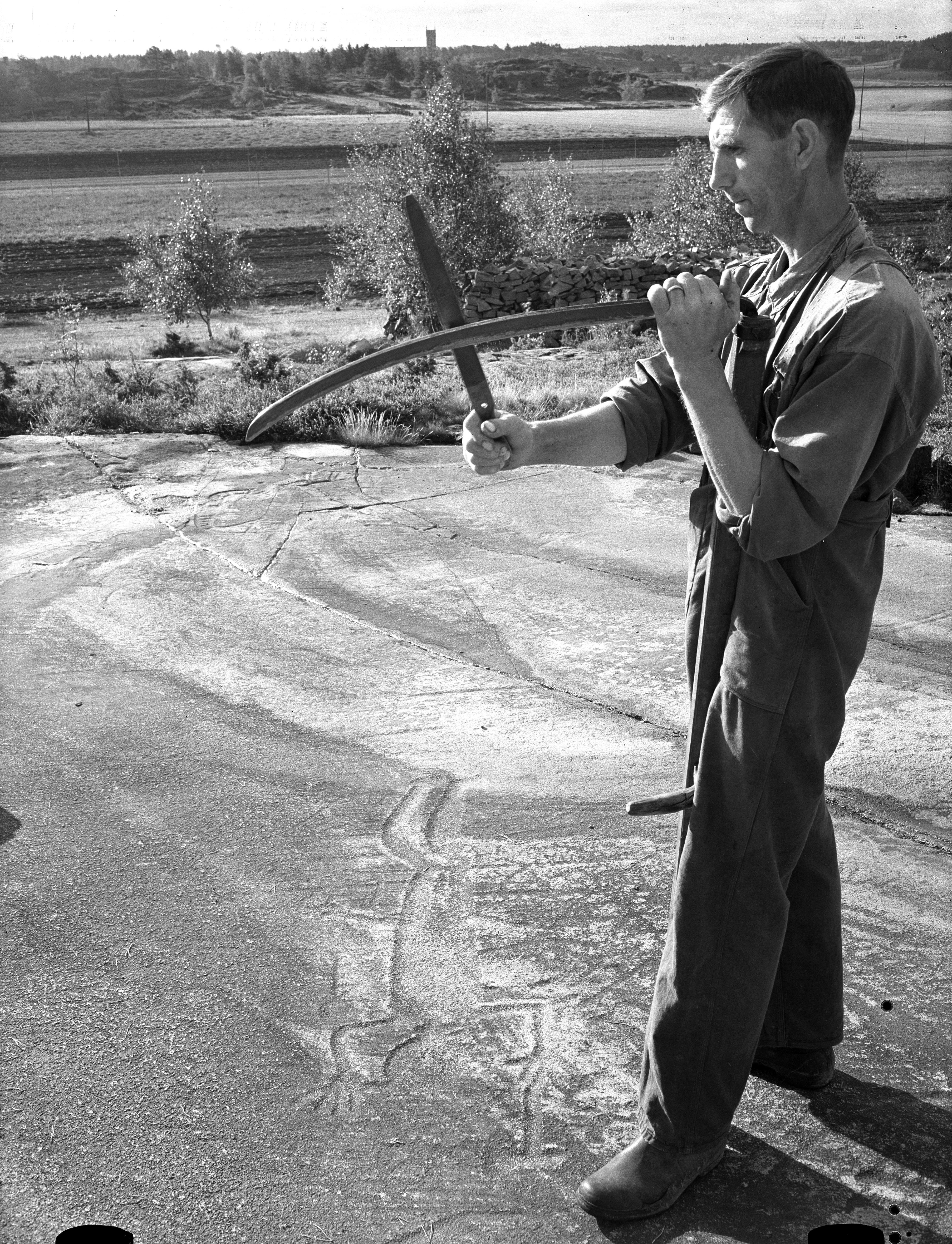 Brastad 1:1. Hällristning. "Skomakarn". Man som slipar lie. Bilden troligen från 1940-talets mitt.