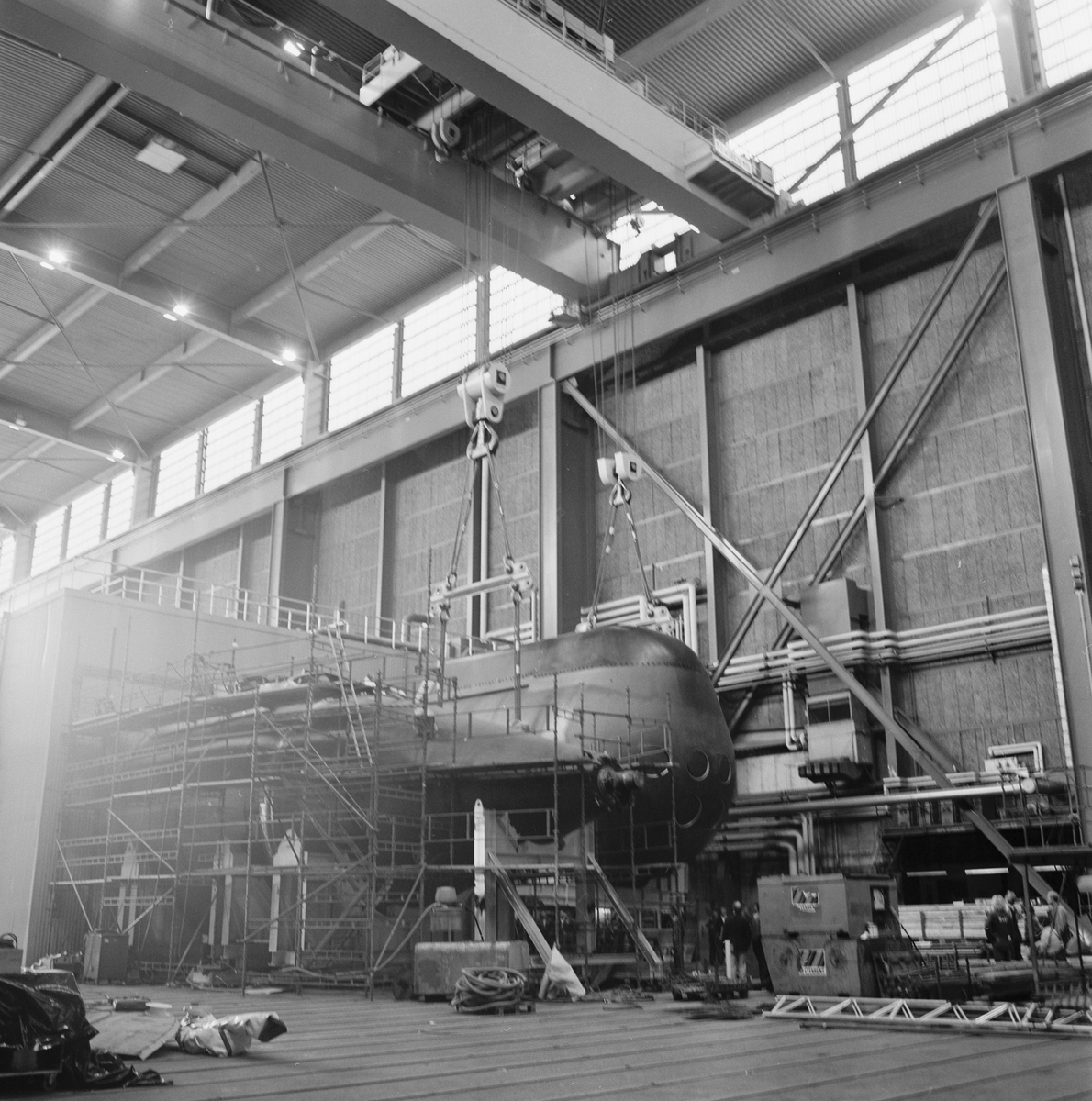 Utlyft av förstäven till A19 ubåten på lastpråm.