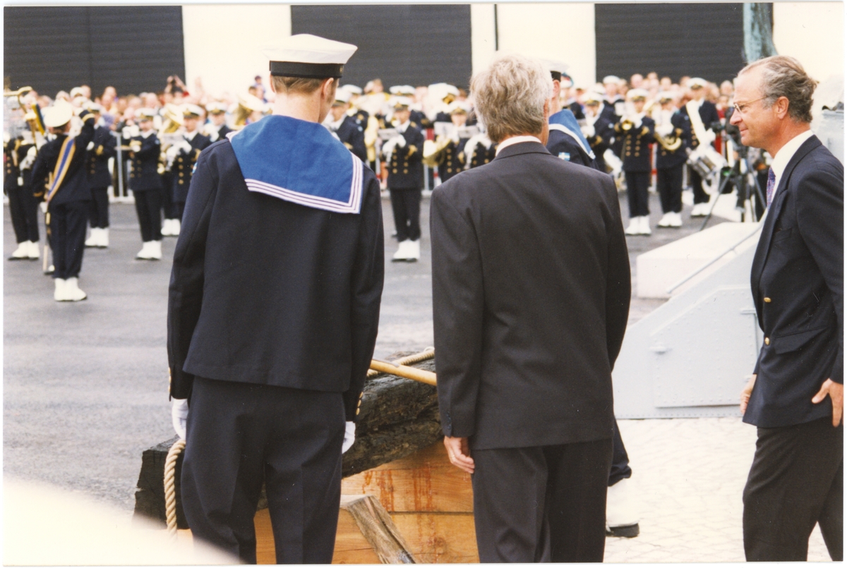 Bilden visar kungen som skrider fram för att hugga genom repet under ceremonin för invigning av nya Marinmuseum 28 juni 1997.