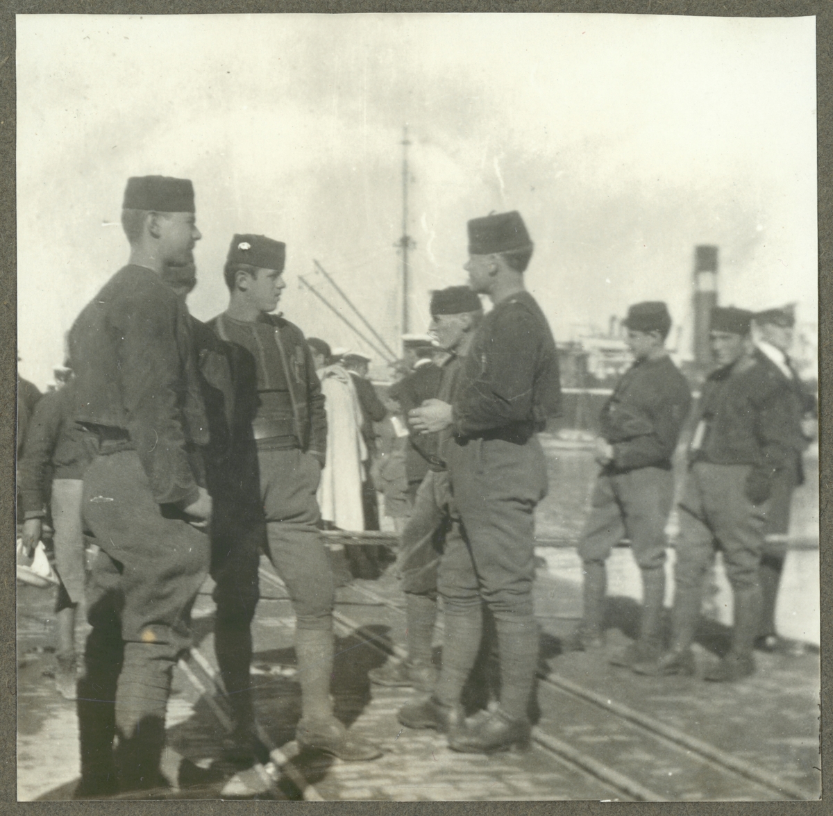 Bilden visar en grupp soldater i hamnen.