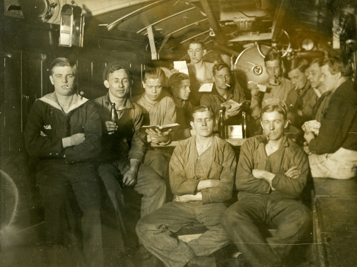 Sjömän i gruppbild ombord 1.klass torpedbåt PERSEUS. "Torpedrumsro". Femte personen från vänster i mellersta raden heter Gustaf Andersson.