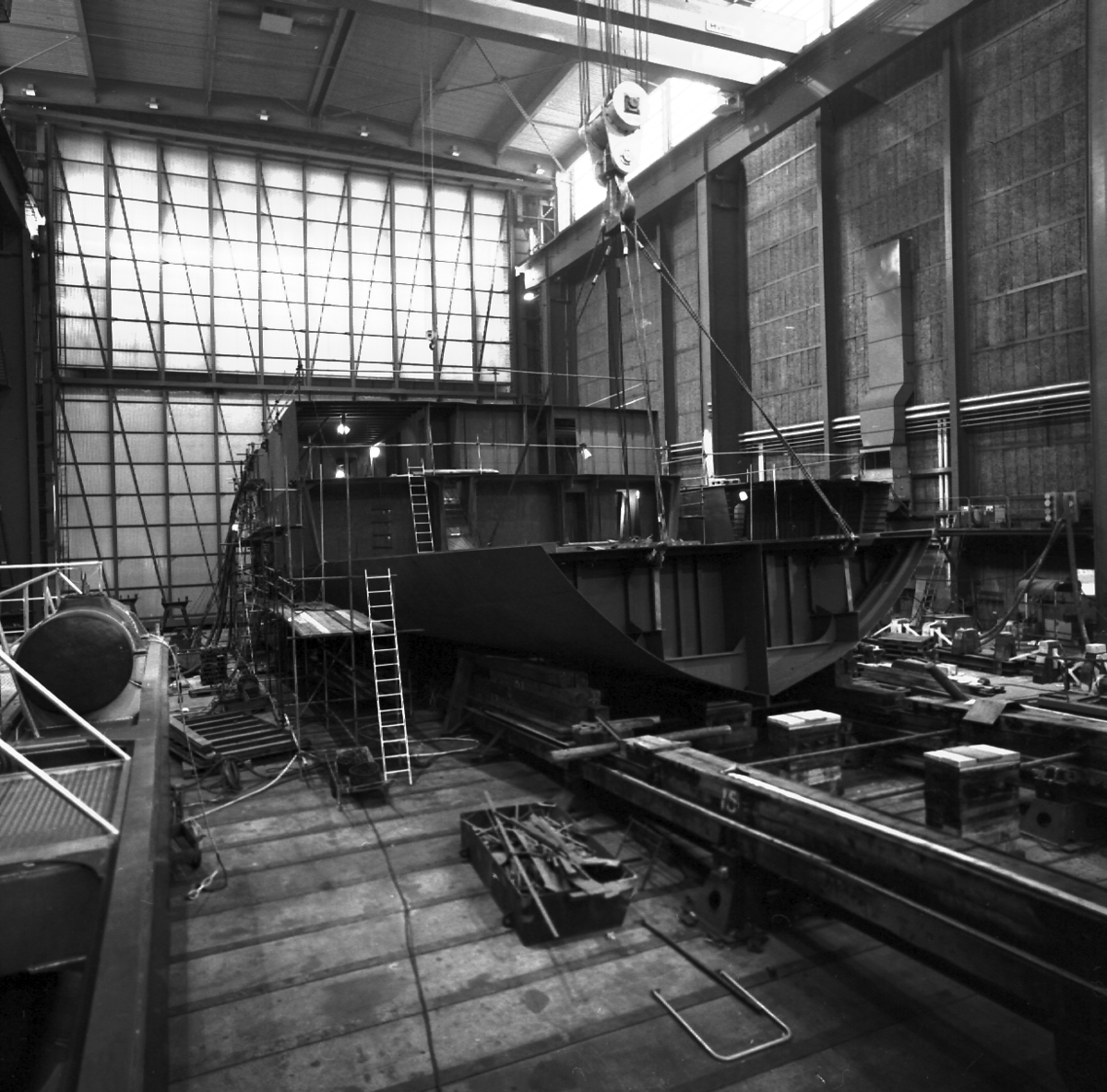 Spica III och bevakningsfartyget under byggnad i skrovhallen, samt vedettbåtar