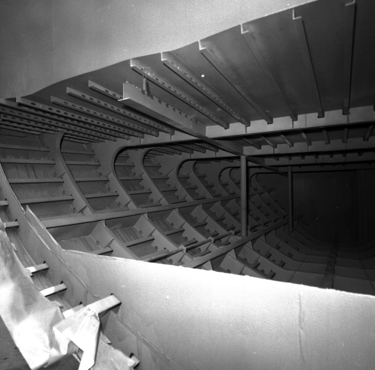 Spica III och bevakningsfartyget under byggnad i skrovhallen, samt vedettbåtar