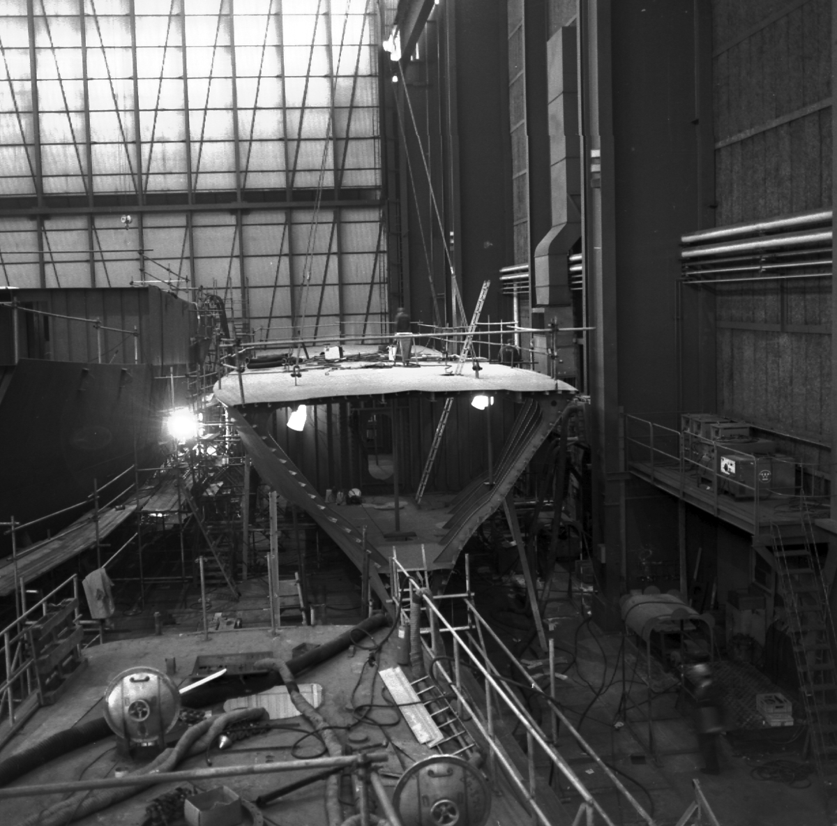 Spica III och bevakningsfartyget under byggnad i skrovhallen, samt vedettbåtar