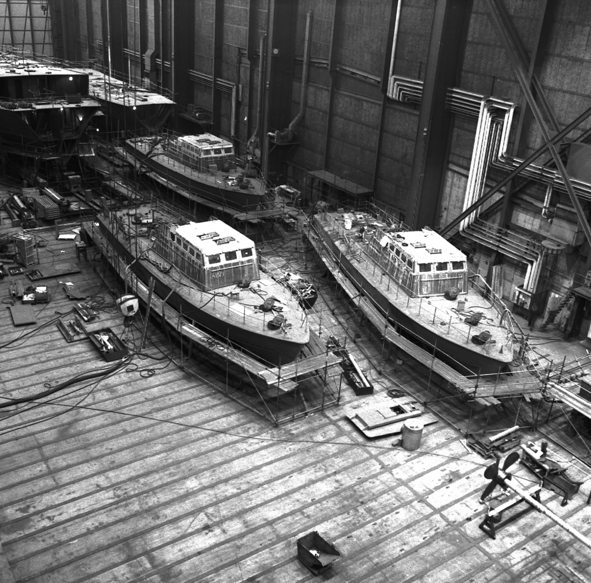 Spica III och bevakningsfartyget under byggnad i skrovhallen, samt vedettbåtar