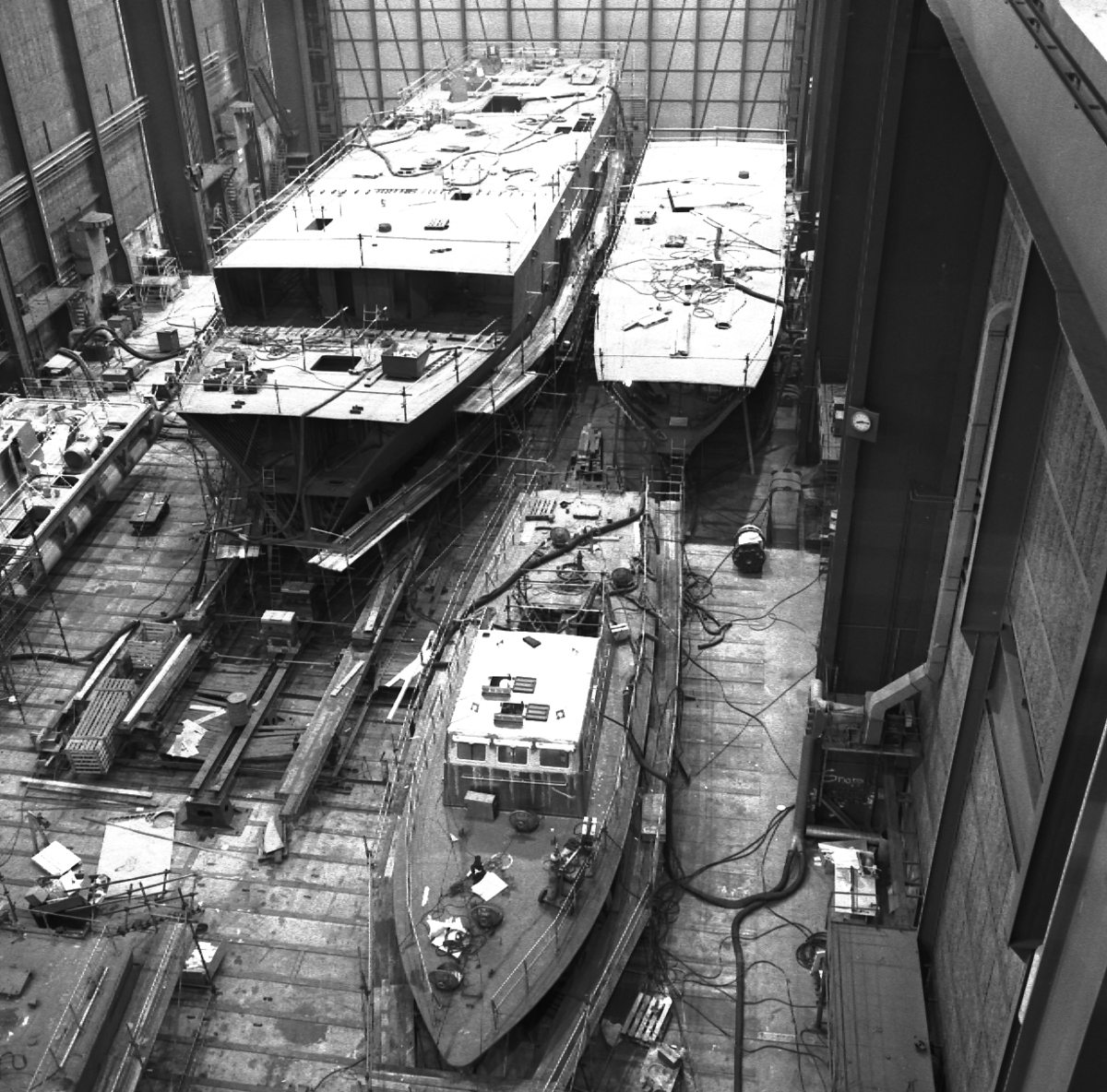 Titel: Spica III Spica III och bevakningsfartyget under byggnad i skrovhallen, samt vedettbåtar