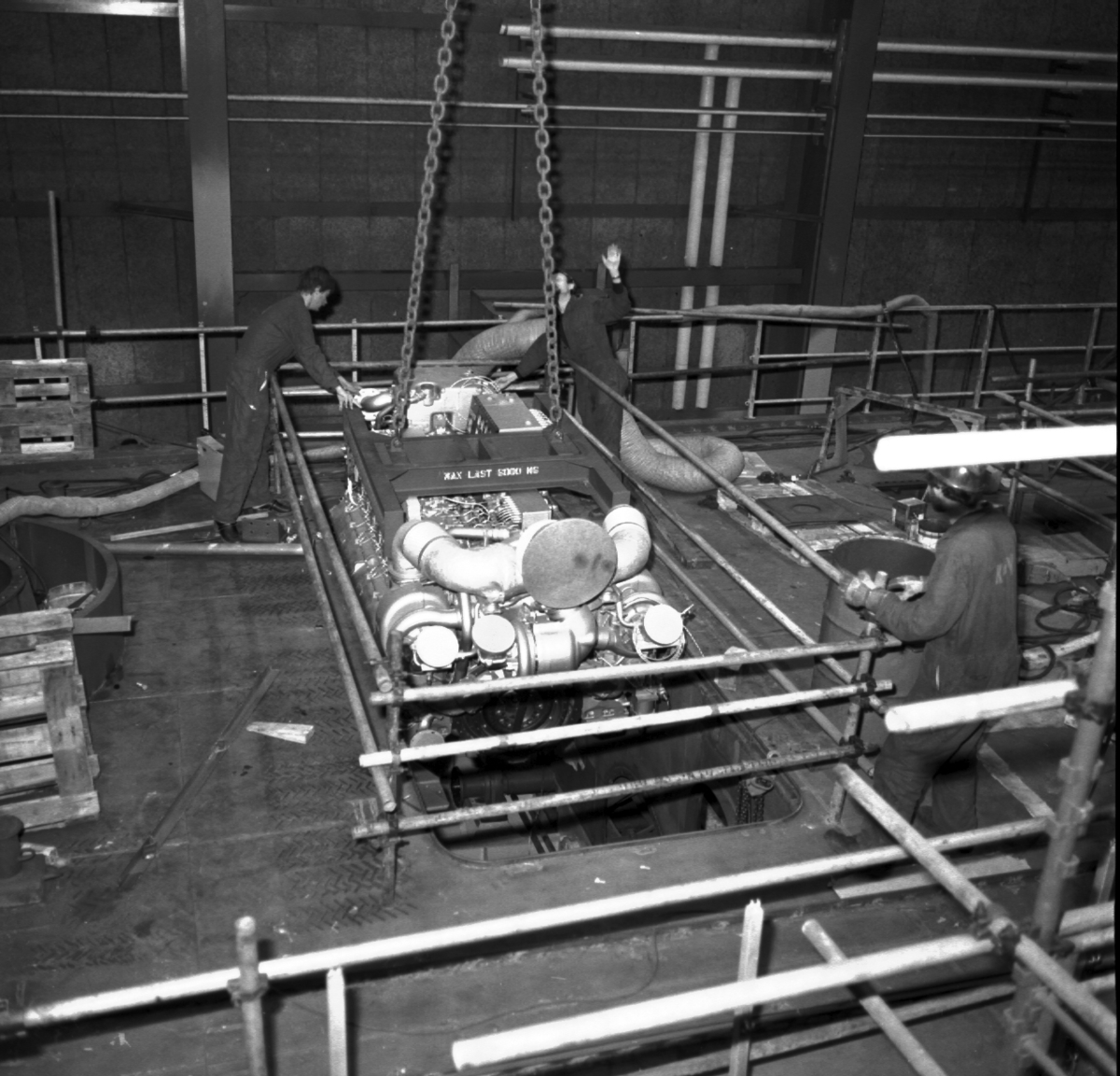 Lyft av motor till Spica III i skrovhallen\\\\anm. neg ingår i en serie om 7 st varav endast det första\\V 92879 scannats/gp