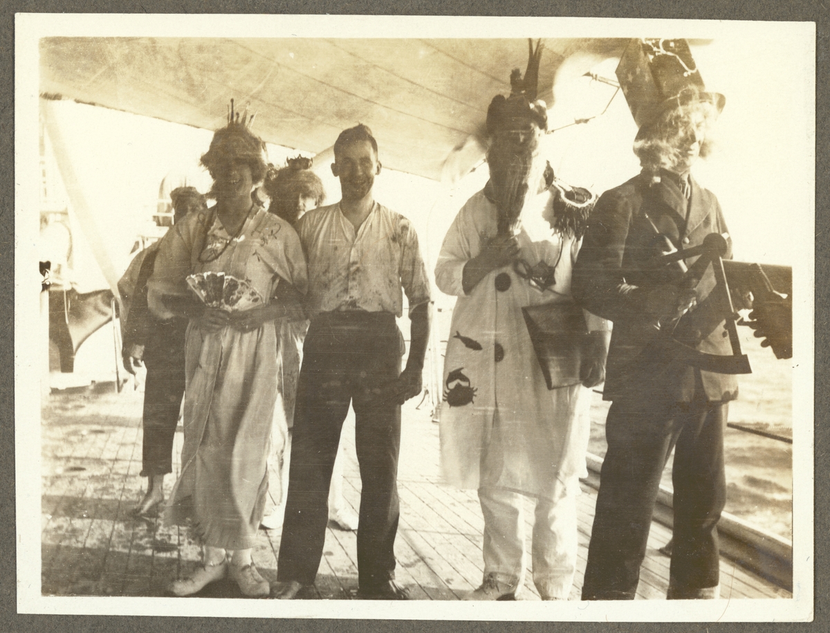 Bilden visar utklädda sjömän under linjedopet ombord på Fylgia.
